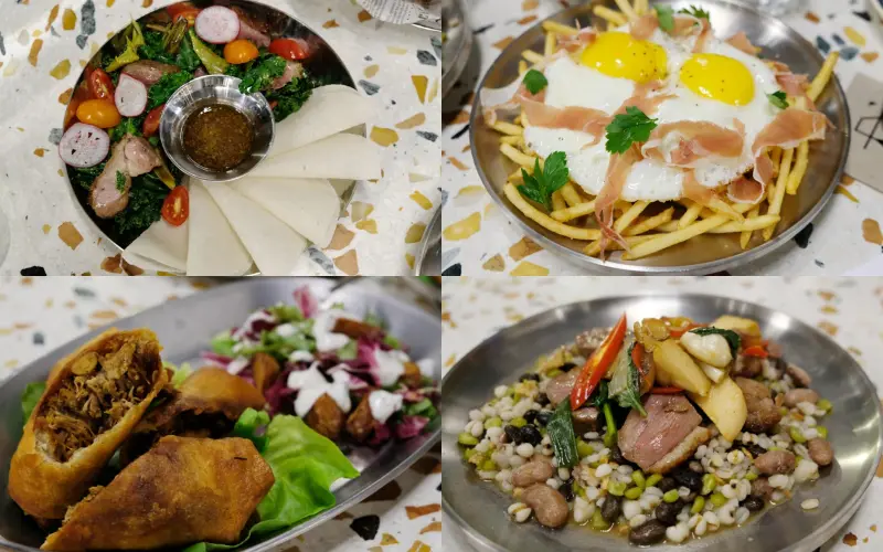 ▲韭蔥鴨包肉380元(左上)、黑啤釀豬肋排燉豆&捲餅720元(左下)、西班牙風味盤300元(右上)、三杯翅鴨胸&殼物飯400元(右下)