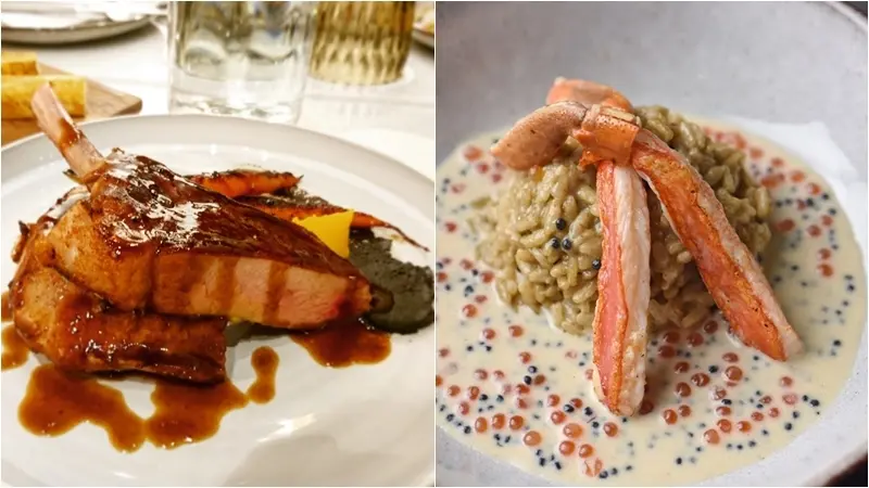 ▲帶骨豬里肌880元(左)/ 經舒肥烹調後的豬里肌內裡粉嫩,香煎上色後逼出油脂焦香,佐以橙漬過後的紅蘿蔔,酸甜味道解膩之外,更能凸顯紅肉風味,鹹、甜、酸中達到最舒服的味覺平衡。魚卵松葉蟹燉飯580元(右)/將熟悉的日式風味融入燉飯中,米飯不僅吸飽蟹味噌、醋薑、昆布高湯中精華,炭烤後的松葉蟹腳更添香氣,最後淋上白酒奶油魚子醬,每一口都能嚐到魚卵在口中爆開與燉飯米心的多層次口感。