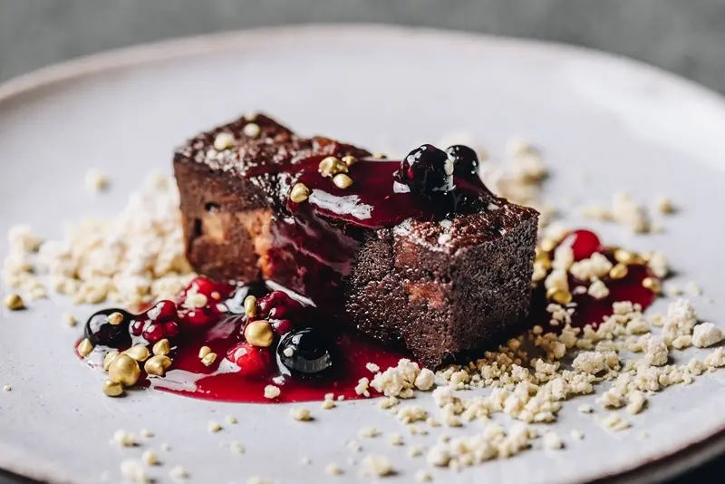 ▲巧克力布里歐麵包布丁280元/法式奶油布里歐麵包與巧克力製成的麵包布丁,口感近似布朗尼,搭配紅酒與莓果熬煮的酸甜醬汁,以及經液態氮急速冷凍而呈現粉末狀的鴨肝冰淇淋,淡淡的鴨肝鹹香與油香,加上紅酒香氣,是成熟大人味。