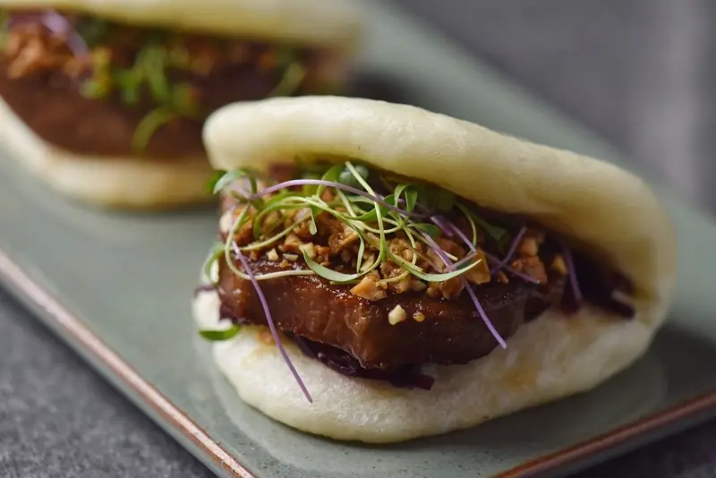 ▲麻辣牛舌360元/ 牛舌慢燉後口感鮮嫩中帶點彈性,浸入麻辣醬後以細火慢煨,再以熱熱軟軟的刈包包覆,搭上酸甜紫高麗菜、焦糖榛果碎,甘甜滋味圓潤了麻辣香。