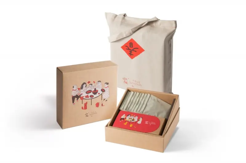 提袋上更以一幅暖紅春聯「春」為點綴,融合傳統意涵「春到」,讓布提袋盛著迎春的美意祝福。包裝盒則是以質樸的原色搭配喜洋洋的暖紅色,呈現一年一度的親友團聚、回家過年的家常畫面,描繪出年節最平凡實在、卻也最幸福溫暖的景象。