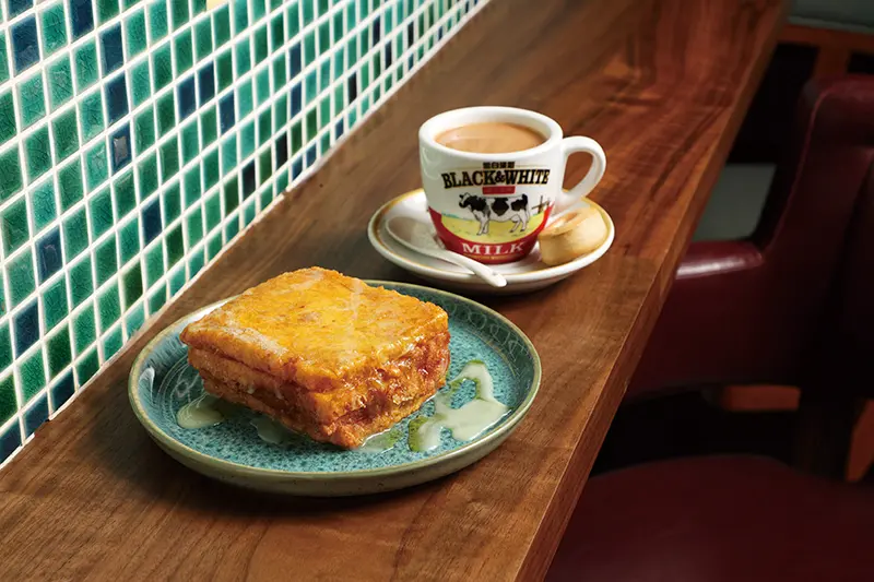 ▲西多士150元(前)/金黃的西多士,在糖漿與煉乳的襯托下,感受到閒適的餐食時光。絲襪奶茶120元(後)/熱/港式必點飲品。