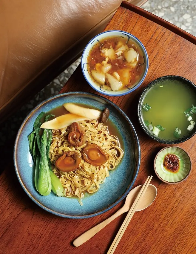 ▲鮑魚撈麵350元(前)/鮮明口感令人難忘。桃膠雪梨糖水70元(後)/正宗港式甜品,嚐出不甜膩的食材原味。