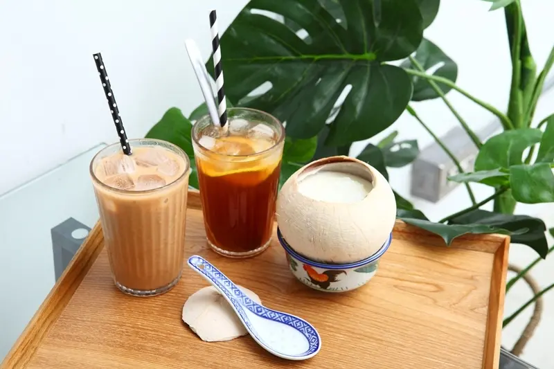 ▲椰皇燉蛋白185元(右)/道地港式養身甜品。檸檬水65元(中)/酸甜適中。港式奶茶75元(左)/融入香港茶葉泡製,口感香醇濃郁。