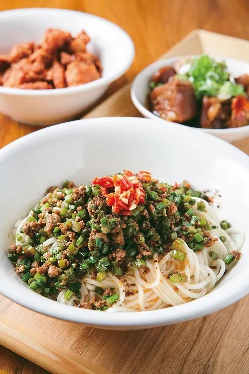 ▲蒼蠅頭拌麵110元(前)/使用KiKi餐廳招牌川菜,調整辣度之後結合乾拌麵,香辣過癮。麻辣燒蹄花80元(右後)、辣子雞丁80元(左後)/KiKi餐廳特色菜,一個人也能享受川菜館的美味。