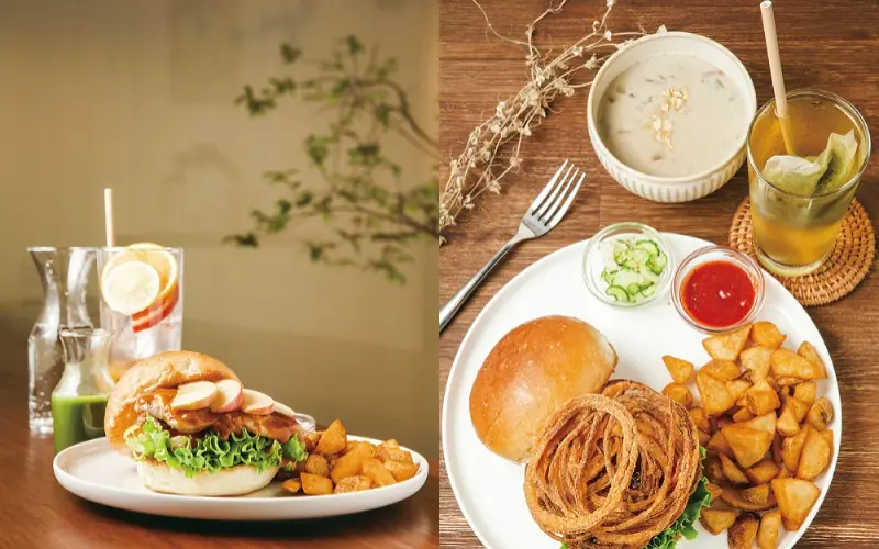 ▲橫濱咖哩蘋果雞肉堡250元(左前)/以蔬菜、香料熬煮出濃郁醬汁,淋上嫩煎雞肉,再放入生菜、蘋果切片,增添清爽氣味。店內漢堡皆附薯角、日式季節醃漬小菜與自製番茄醬。葡萄柚抹茶氣泡飲120元(左後)/將元素拆解開來分別供應,讓客人可依口味喜好自行調配,可先嚐試氣泡飲原味,再依序加入淡、濃比例的抹茶。洋蔥富士山牛肉堡280元(右前)/牛五花搭配拿坡里醬,再霸氣鋪疊 酥炸洋蔥,香氣迷人。坪林清香包種90元(右中)/使用自家舅舅於坪林栽種的茶,瀰漫手摘茶的清香氣味。招牌濃湯90元(右後)/每季推出口味不同的湯品,現供應洋菇馬鈴薯濃湯。