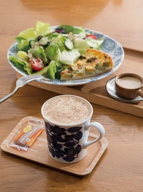 ▲黑糖拿鐵140元(前)/使用沖繩黑糖,香甜迷人。法式鹹派180元(後)/現烤鹹點,提供蔬菜火腿或南瓜雞肉2種選擇,另附上輕食沙拉、沙拉醬,健康又兼具飽足感,深受客人喜愛。