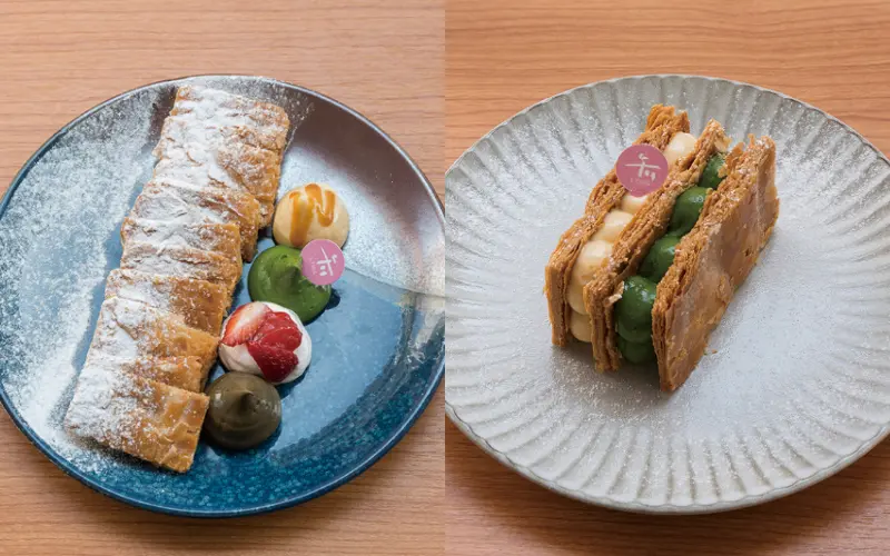 ▲太划算了吧!綜合千層酥180元(左)/一次就能享用原味、小山園抹茶、草莓乳酪與焙茶等4種餡料風味,創造多層次的吃法與樂趣。小山園抹茶千層酥190元(右)/使用小山園抹茶製成,口感較為濃稠,偏大人系風味。