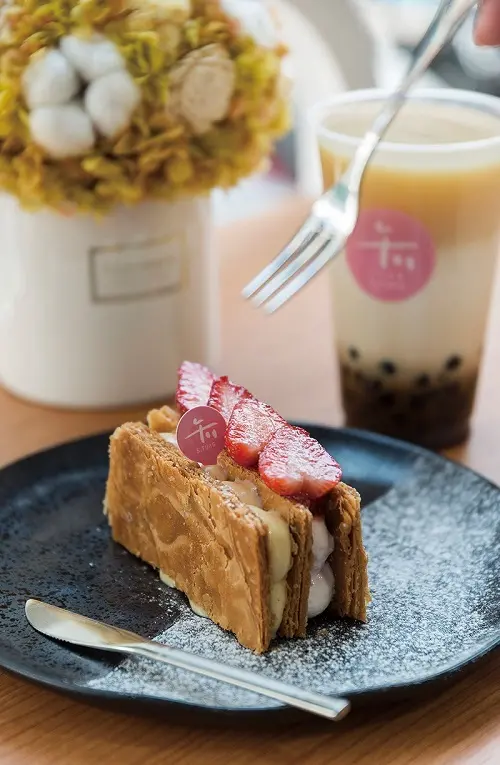 ▲草莓千層酥200元(前)/店內推出的季節驚喜限定款口味,在酥脆的千層酥裡夾入原味、草莓乳酪卡士達內餡,原味內餡除了加入香草籽、海鹽焦糖,另以酒作為提味,香氣迷人;草莓乳酪口感則像極優格,再搭配新鮮草莓,酸甜好吃。炭焙烏龍生乳60元(後)/特別選用台灣阿里山烏龍茶,茶香與奶香比例搭配得剛剛好,讓人一喝就愛上。![]()