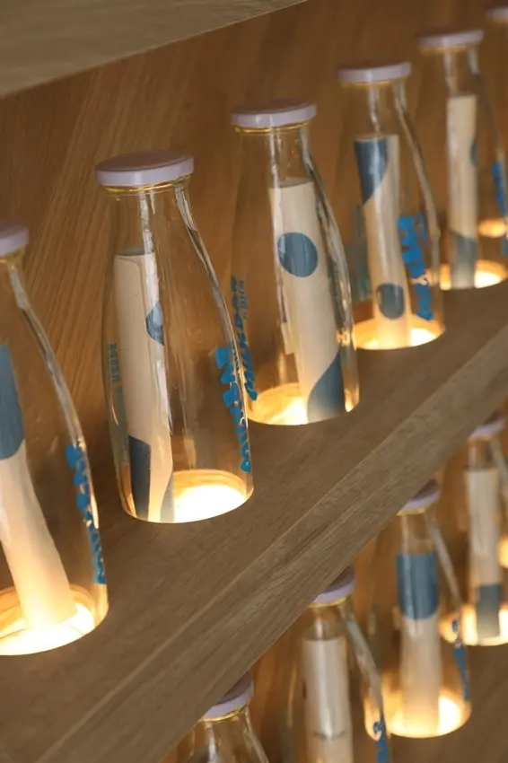 而入門的牛奶牆也不只是拍照打卡用,每個牛奶罐中,都有張來自不同名句的紙條,為日常點綴不同的故事。