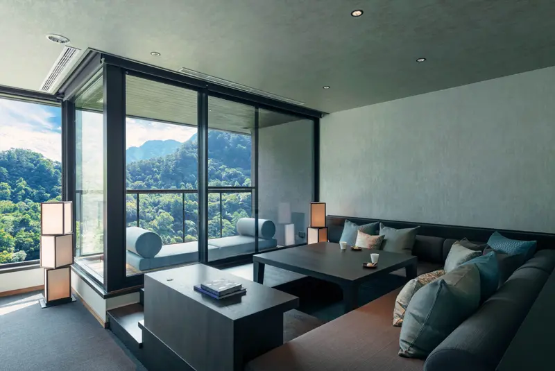 虹夕諾雅 谷關是星野首次跨足日本以外地區並以「溫泉」為主題的豪華度假村,選定谷關充分運用當地豐沛的湧泉,以及享有坐落群山環繞的山谷優勢,再結合星野擅長打造舒適室內空間,例如規劃所有客房皆採樓中樓設計,其中一層為溫泉專用樓層,可以透過窗戶眺望雄偉的群山和度假村內的水之庭園,房內也設置了泡完溫泉後可以休息乘涼的空間與大片落地窗。