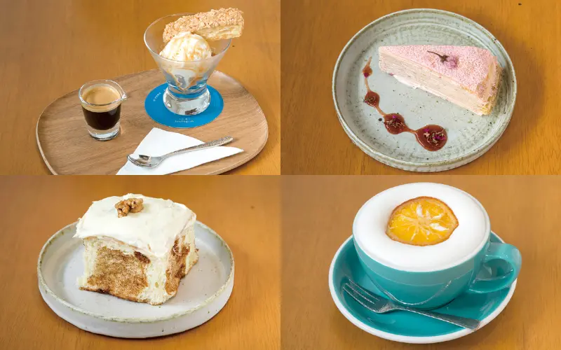 ▲阿芙佳朵130元(左上)/香草冰淇淋、杏仁千層酥與濃縮咖啡的創意吃法。櫻花莓果千層蛋糕(假日限定)180元(右上)/極具浪漫情懷的季節風味。依季節更換風味,不定期推出隱藏版千層。奶油乳酪黑糖肉桂捲80元(左下)/鋪疊自製研發的奶油乳酪,更增添風味。小太陽卡布奇諾140元(右下)/以蜜漬橙片象徵太陽,是店內代表性飲品。