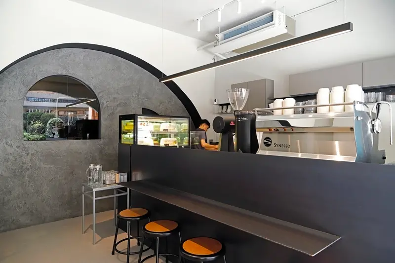 不同於瑞安店的木質感,半圓形的窗型貫穿整家店,以黑、白、灰突顯出整體沉穩感,半圓窗門後方還設有自烘空間與手作甜點室,並從咖啡沖煮方式、甜點製作呈現,表現出更多自有的優勢。