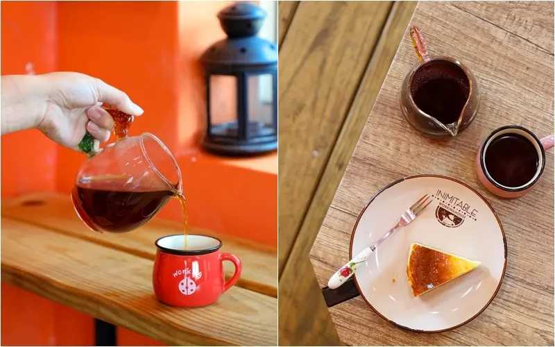 ▲繽紛海洋(虹吸)130元(右上)/店內配方豆,焦糖、蜜地瓜香氣,口感厚實。手工蛋糕80元(右下)/重乳酪蛋糕,搭配手沖、虹吸咖啡最合拍。繽紛海洋(手沖)130元(左)/與虹吸式咖啡呈現不同風味,口感較清爽。![]()