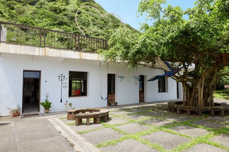 從容的用餐空間外,隨著鞦韆搖曳,眼前龜山島逐漸佔據眼底,一旁50歲老榕樹盤根默默守護著這片秘境,樹上的藍鵲裝置藝術一副欲飛翔的姿態,似乎以行動告訴旅人,來到這裡就盡情感受自由的時光吧!