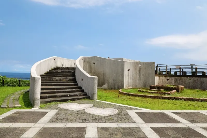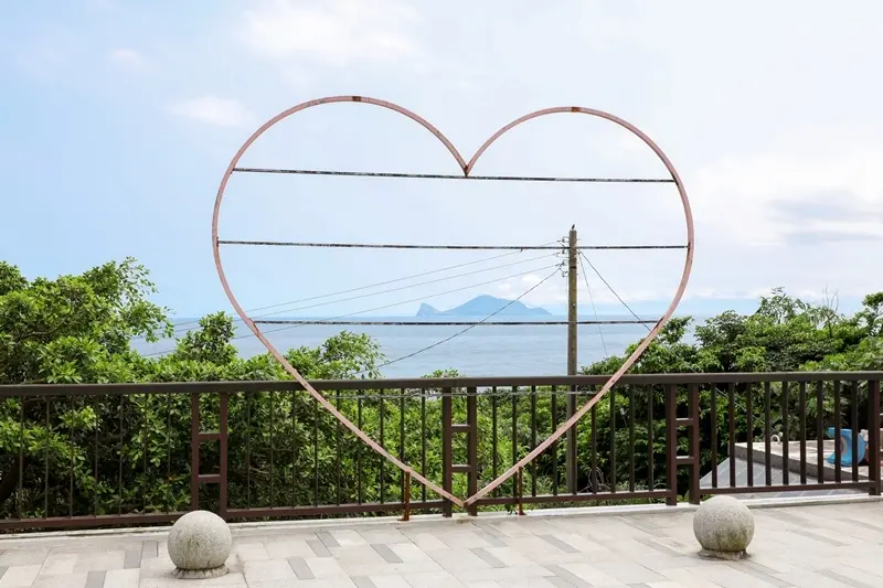 除了開車前往,這裡也是許多單車騎士的休息站,自一旁高處草原慢慢趨近觀景台,海風吹拂備感涼爽,外型設計為一大愛心的四角窟觀景台,鏤空雙愛心造型也是許多遊客最愛的取景點。