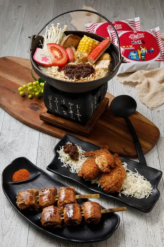 ▲古早味肉燥風味鍋豬 129元/起(上)、 肉燥手羽先 45 元/支(中)、 豬五花捲肉燥麵60元/串(下)/ 深受學生族群推崇的激旨燒鳥、激旨串揚,獨家合作的 3 道統一麵料理運用日式火鍋、串燒及炸物的製作手法,創意程度讓人連聲讚嘆!