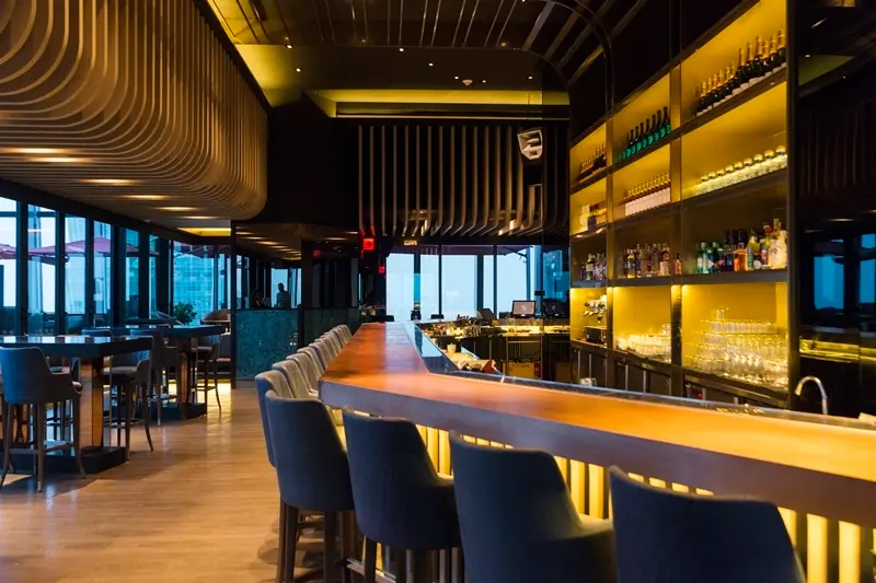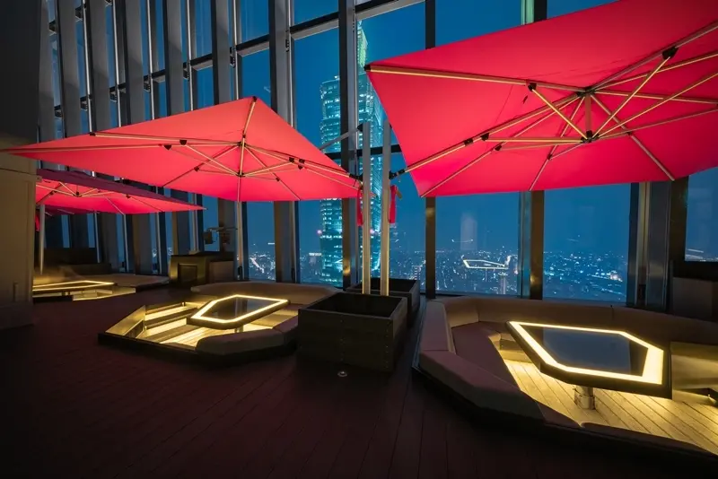店內空間分別規劃餐廳區及酒吧區,酒吧另設置戶外環景私人嵌入式包廂,讓人無時無刻享受高空景色,尤其緊鄰台北101大樓的視野景觀更是迷人,白天、夜晚都精采。