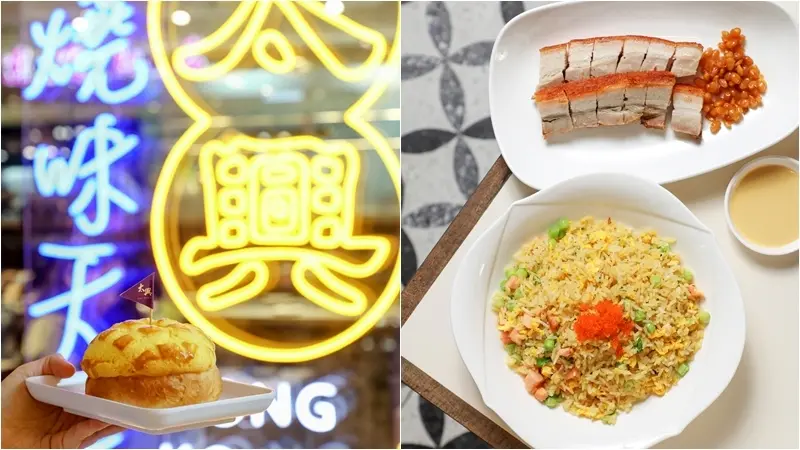 ▲自家製菠蘿包40元(左)/酥皮紋理分明,口感香酥順口,麵包鬆軟彈牙,入口綿密細膩。五星級燒肉328元(右上)、煙三文魚菜粒炒飯280元(右下)/香港燒肉界的霸主,從挑選豬隻到調味、醃製、風乾、烘焙及鬆針等多重步驟,再以自行研發燒烤爐烤製,表皮金黃香脆,多汁彈牙。