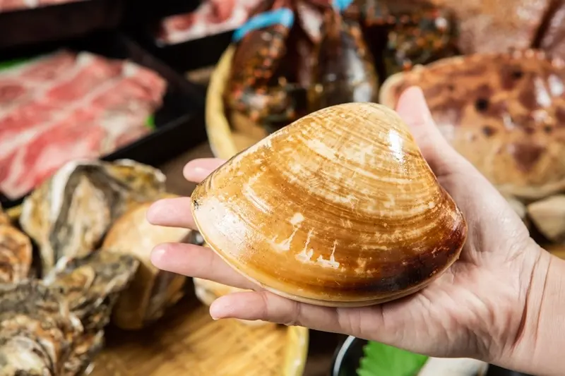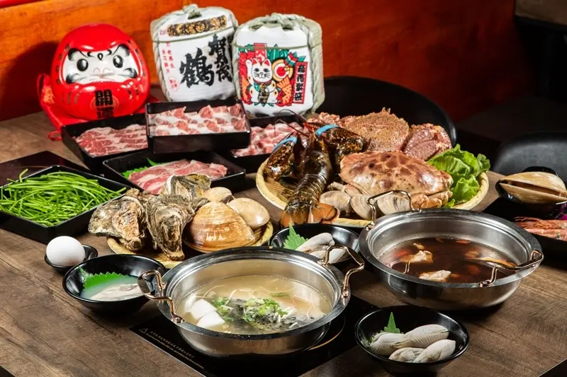 ▲鮭魚湯頭90元(前)/以鮭魚頭燉煮的風味湯頭,CP值超高。藥燉排骨湯頭90元(前右)/放入10多種中藥材燉煮而成的溫潤湯頭。大生蠔、超巨大文蛤、玉米貝 時價(中)/店內供應多種外型巨大的海鮮食材,讓人大飽口福。波士頓龍蝦、北海道毛蟹、加拿大紫鑽黃金蟹、牛奶蛤 時價(中右)/提供各式活海鮮,現點現煮,鮮甜味十足。日本黑毛和牛A5、美國頂級翼板牛、伊比利梅花豬 時價(後)/各式火鍋肉品應有盡有。