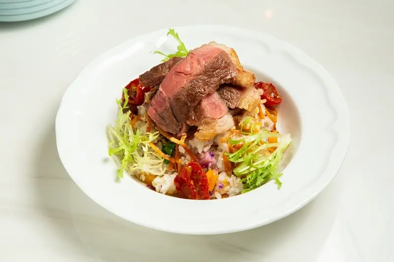 ▲鄉村蕃茄燒烤牛肉漢普頓宮花園飯320元/以蕎麥、薏仁、台梗9號組成的穀物飯,搭配色澤鮮豔的蔬果,成就一道視覺、味覺兼具的主食料理;另放上背肩沙朗,佐以煙燻番茄醬,風味迷人。