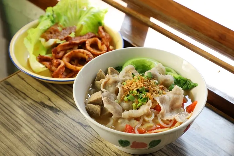 ▲豬肉粉220元(前)/不同於魚頭米粉的湯底,以貢丸、新鮮蔬菜與豬肉片激盪出不同風味。炸花枝80元(後)/創意小食,未來將持續創造新口感。
