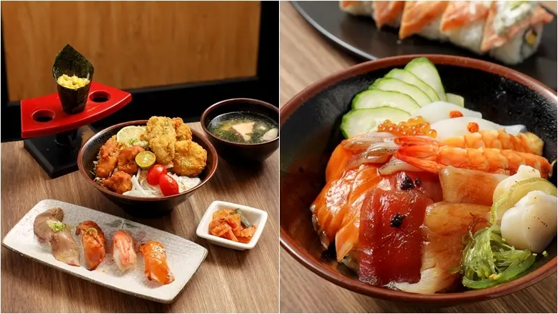 ▲宇宙大爆炸套餐450元(左)/大胃王最愛的自創組合,包含牡蠣、炸豆腐、雞唐揚、自製可樂餅,搭配獨家塔塔醬,呈現炸物大拼盤概念,套餐含小菜4選1、玉米手捲、心愛4貫握壽司、味噌湯。極上盛和海鮮丼350元(右)/以鮭魚、鮪魚、旗魚、花枝、海老、干貝等海鮮食材,打造出絕美視覺的海味饗宴。