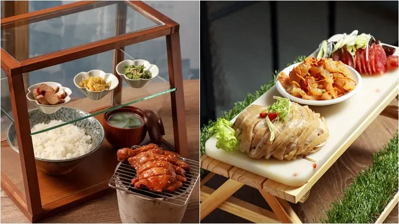 ▲獨饗餐-火焰炙烤八兩雞398元(左)/附白飯、小菜、湯品,重現主廚小時候在金山老家前埕的烤肉氛圍,除了雞肉焦香味,還有燒稻草味道隨風而來。每日小菜不同,共有16種菜色輪替。飯BAR野味菜菜盤578元(右)/開胃必點,精緻呈現也瞬間吸睛。