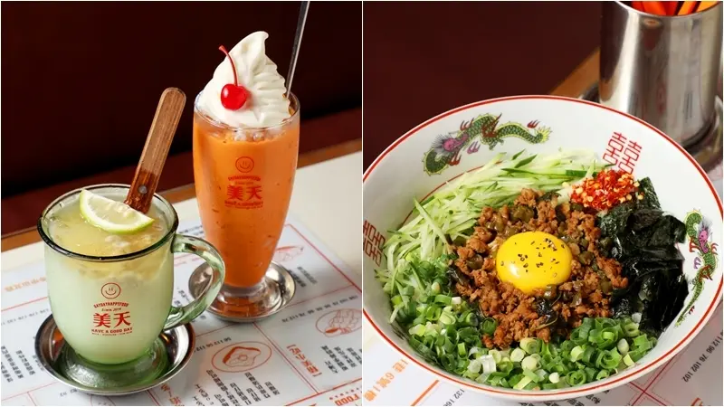 ▲薏仁檸檬82元(左前)/在逐漸變熱的天氣中相當受歡迎,以薏仁湯結合愛玉與檸檬打造清爽口感。霜淇淋泰奶82元(左後)/當泰式奶茶遇上霜淇淋,激盪出去暑甜蜜的好滋味。打拋豬肉麵162元(右)/泰式打拋豬為基底,結合港式撈麵,在麵食盛行的中山區,打造出全新風格。