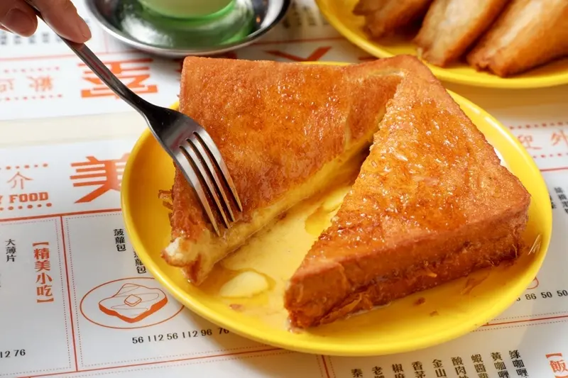 ▲金沙西多士102元/自製鹹蛋黃金沙醬,切開瞬間畫面引人食欲大開,建議3~4人共享。