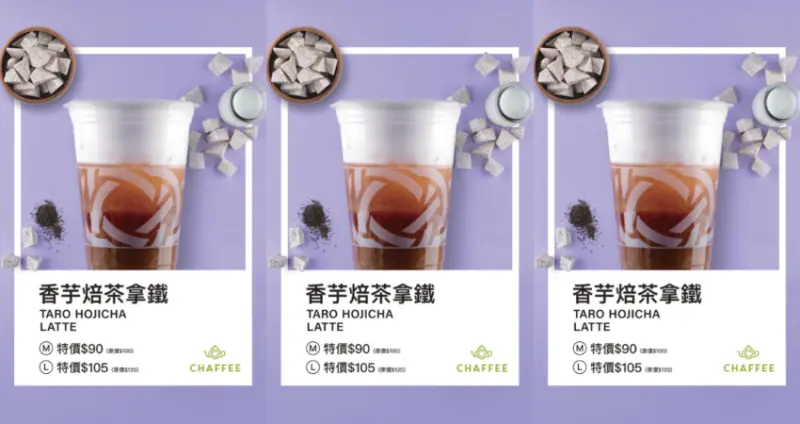 香芋焙茶拿鐵 中杯特價90元(原價100元) 大杯特價105元(原價120元)