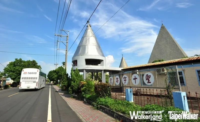 聖十字架堂由鐘樓、聖洗堂、聖殿、聖體小堂等四個角錐尖頂組成,最大特色是外觀皆包覆鋁皮,角錐尖頂上各有不同基督信仰標記如公雞、鴿子、十字架、王冠,獨具意義。