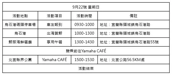 Yamaha 「 YJT 」 9月來到宜蘭將帶領Yamaha的重機車友出海探險,除了飽覽龜山島的美景外,更要與您一同出海賞鯨,與鯨豚們來場親密的邂逅!
