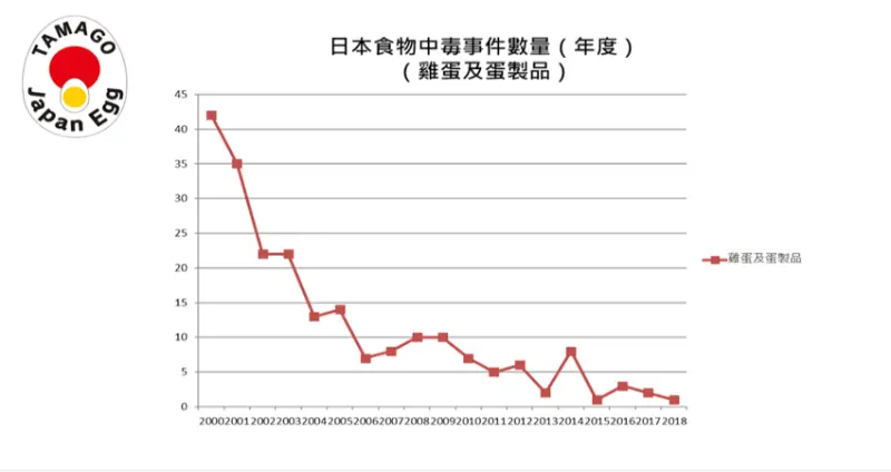 圖:日本全年的雞蛋銷量達320億顆,但因雞蛋引起的食物中毒案件年年遞減,2018年僅發生一起