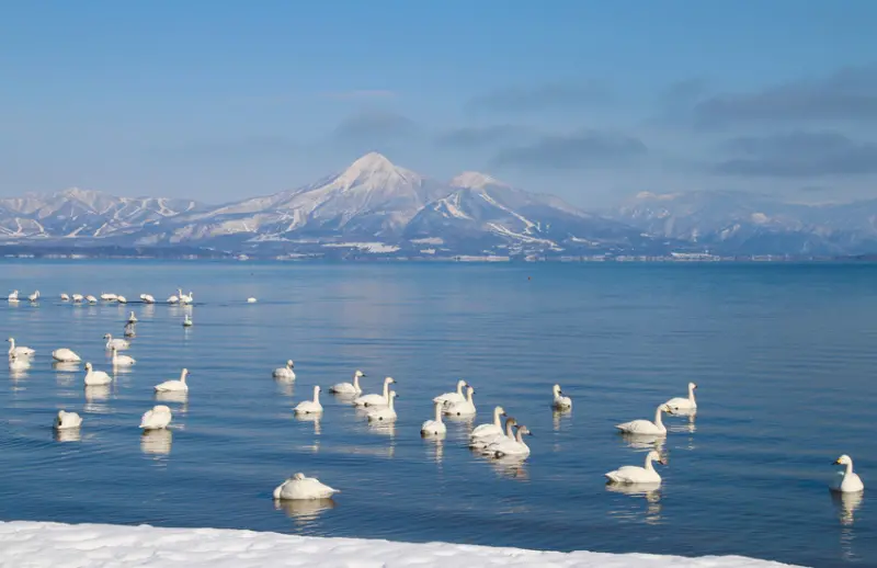 猪苗代湖為日本第4大湖,因湖水透明度高又有天鏡湖之稱,野口英世紀念館冬季時天神濱側可看到因冰水拍打湖岸樹木形成的水花冰奇景,而在長濱側則聚集大批來過冬的天鵝,襯著透藍湖面及遠方會津磐梯山,形成靜謐療癒的風景畫,來此還能順遊野口英世紀念館及天鏡閣等景點喔!
