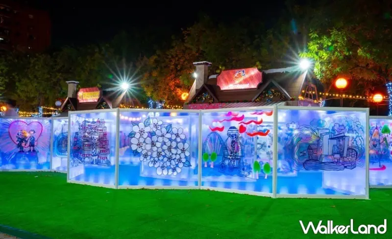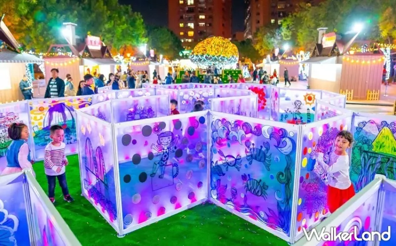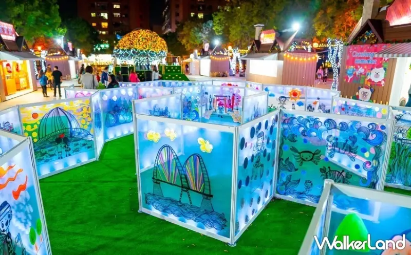 此外,板橋車站站前廣場也同步變身兒童的森林遊樂場!由36片透光壓克力板作組合成的「光影迷宮」,在繪本插畫家詹詠晴的巧手之下,以童趣筆觸展現新北市的景點與特色,搭配夜間光影變化,讓小朋友們嘻笑穿梭其間、玩得不亦樂乎,一秒化身成小朋友的絕佳放電場域。