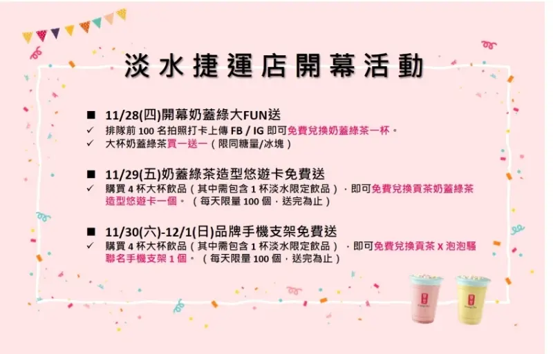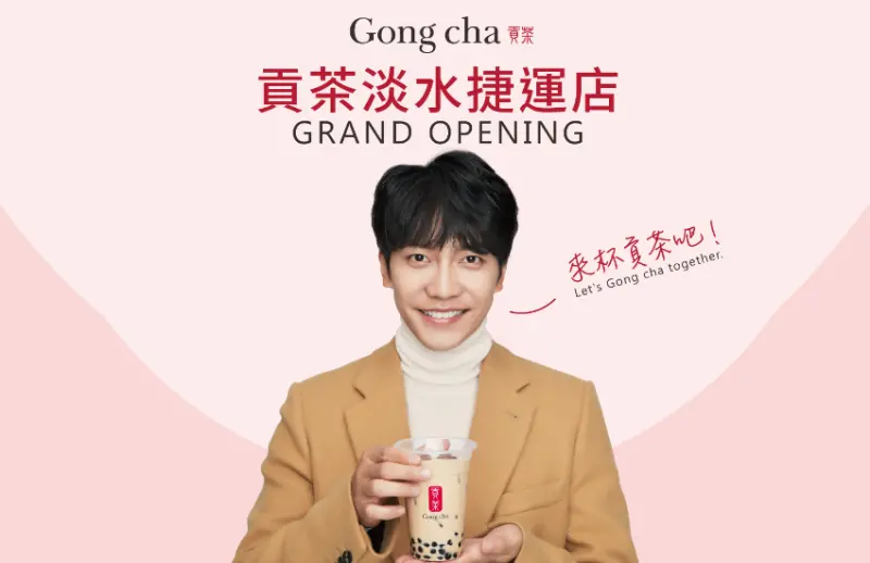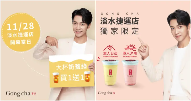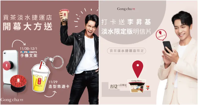 除了開幕當日優惠活動,11/29~12/01開幕期間購買4杯大杯飲品(其中需包含1杯淡水限定飲品)還能免費兌換質感滿分的限量品牌贈品─「貢茶奶蓋綠茶造型悠遊卡」(11/29) 及「貢茶 x 泡泡騷聯名手機支架」(11/30-12/01)。另外再特別加碼,凡於開幕期間與貢茶全球代言人「李昇基」人形立牌合照上傳FB/IG,即可免費兌換「李昇基淡水限定版明信片」一張(數量有限,送完為止)。