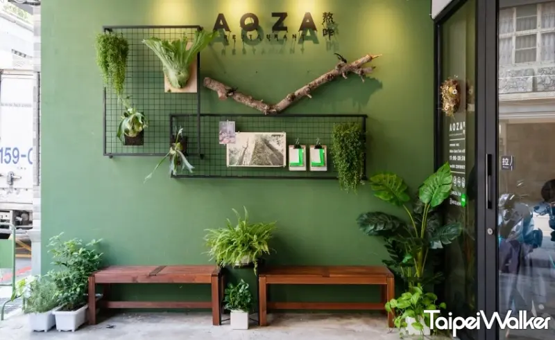 坐落於滿覆綠意、瀰漫愜意氛圍的范特喜文創聚落旁,AOZA熬咋店主人張柏、小香特別將這份視覺享受延伸進店裡,以綠色作為主體色系貫穿空間設計,從牆面、植栽佈置到制服,皆選用深淺不一的綠色系堆疊出層次美感。
