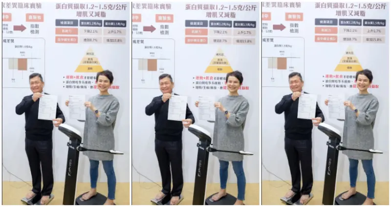 年過40歲,肌肉量會以每十年減少8%,70歲後則減少15%的速度加速流失,「桂冠營養健康研究室」首次以不同蛋白質比例設計循環菜單,供應70位體況正常40-75歲的熟齡族群,進行共計12週的「膳食蛋白質攝取差異臨床實驗」,以抽血檢查及大腿核磁共振及身體組成分析儀,檢測實驗前及實驗後之結果差異,實驗結果證實在較高的蛋白質攝取,不僅相對增肌減脂、肌耐力提升、血中維生素D含量也上升。![]()