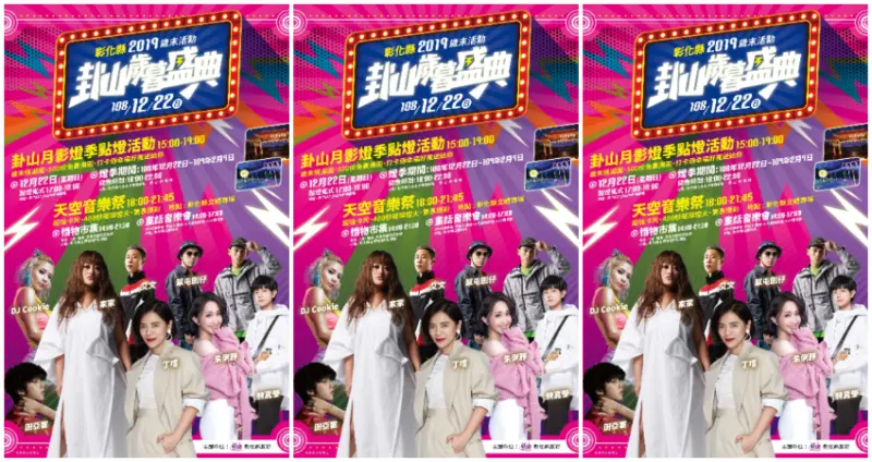 彰化縣政府將於12月22日冬至賀冬節,舉辦「2019歲末活動-卦山歲暮盛典」活動,啟動彰化燈會「彰化月影燈季」璀璨燈節,在彰化縣八卦山大佛前廣場將啟動全長超過2公里的燈區,從108年12月22日17:00-18:00點燈後,每日18:00-22:00開燈,持續展出至109年2月9日,為期長達50天。![]()
