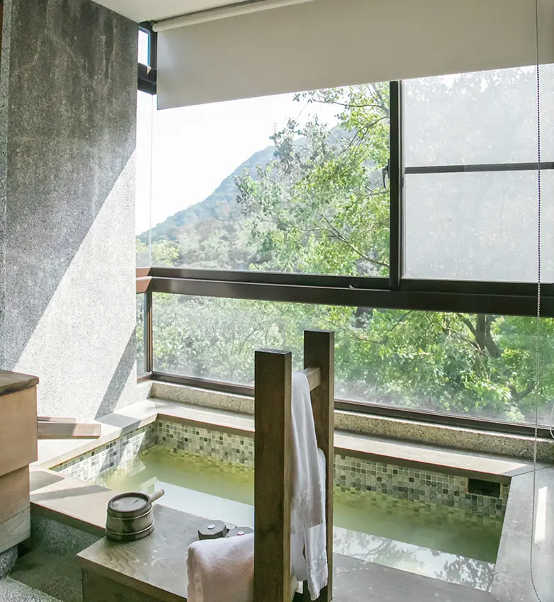 獨具創意的建築體,能透過玻璃窗引入山色美景,浸浴在溫泉裡, 眼看大自然水碧山青、霧氣集散,塵囂一掃而空。![]()