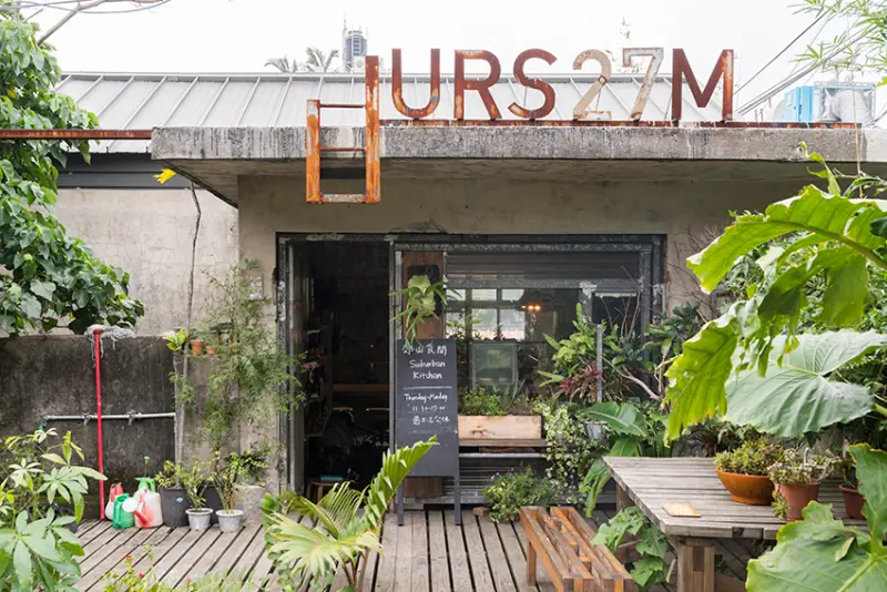 原為自來水廠老舊宿舍群,在成為政府活 化再生計畫之URS基地後,由衍序規劃設計顧 問公司進駐,希望成為一處人與大自然互動交 流的平台,也是唯一一座在山裡的都市再生基 地。空間融入美學工藝、食農文化、以自然環 境感知等議題的展覽及課程活動,於一年多前 開幕的郊山食間,提供茶飲、甜點,綠意環繞 的空間希望打造出一座郊山中家的氛圍。