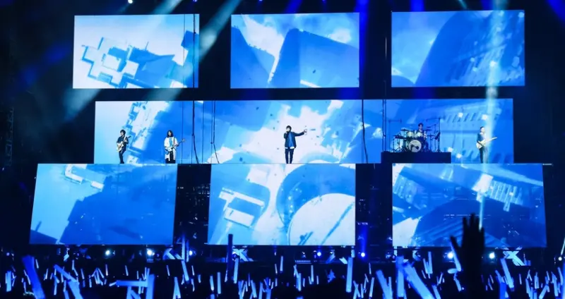 五月天今年展開「Mayday 2019 Just Rock It!!!“藍 | BLUE”」巡演,一路從大阪、香港、北京、上海掀起藍色狂潮後,12/21重返桃園。五月天以《瘋狂世界》接開序幕,接著演唱《擁抱》、《愛情的模樣》、《透露》等歌曲,現場更放送彩帶、煙火,讓全場五迷沸騰尖叫。![]()