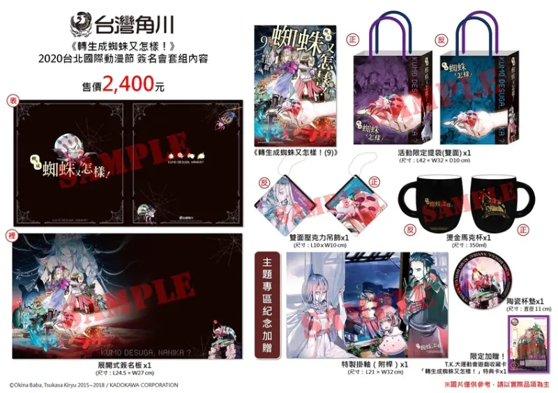 簽名會這次有兩個場次,一個是「南港展覽館場次」開放150個預購名額;而「安利美特場次」則開放80個預購名額。「轉生成蜘蛛又怎樣!簽名會套組」(售價2,400元)內含「輕小說第9集」、「展開式簽名板」、「雙面壓克力吊飾」、「燙金馬克杯」、「活動限定提袋」、主題專區紀念加贈的「特製掛軸(附桿)」、「陶瓷杯墊」及滿額贈限定「特典卡」,每人限預購一組,數量有限,售完為止。