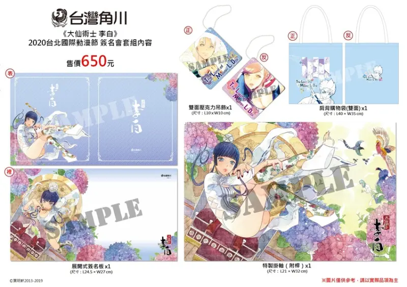 為回饋廣大的忠實李白粉絲,台灣角川特別請葉明軒老師精心繪製絕美特繪圖,規劃以「美人」為主題的【2020台北國際動漫節 簽名會限量套組】,內含「展開式簽名板」、「肩背購物袋」、「雙面壓克力吊飾」及「特製掛軸(附桿)」。簽名會限量套組於台灣角川官網販售,粉絲們請把握良機。![]()