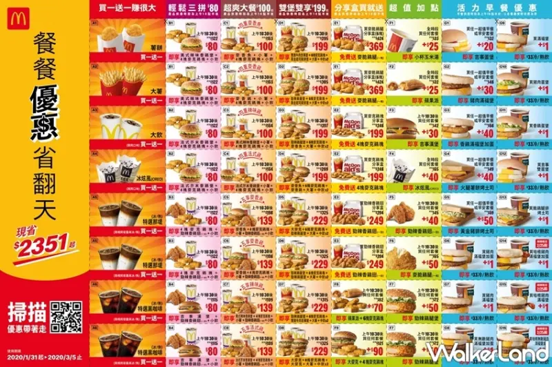 這次的優惠券將在1/31正式推出,並可以使用至3/5,連續35天的期間內都能夠享有買一送一、80元三拼、100元超爽大餐、超值雙堡雙享、超值加點、早餐主餐加1元多飲料、分享盒加量不加價等7大優惠,就是要讓麥當勞粉絲從早餐一路吃到消夜。