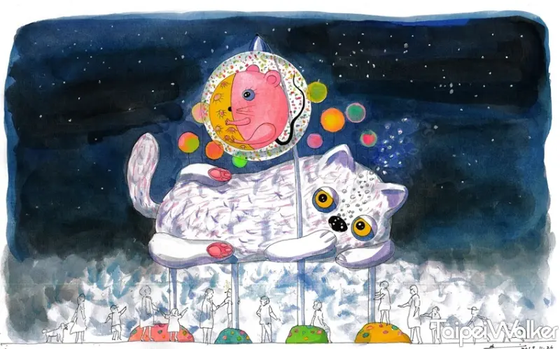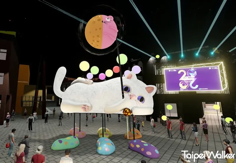 因此,這次創作的西區主燈《躲貓貓》,以俏皮可愛且療癒感十足的貓咪追老鼠,來展現城市的慧黠活力,也希望能帶給賞燈者愛與幸福感。十分關注社會政治的林舜龍,將許多當代政治與社會元素,以充滿童趣的泡泡、雪花燈、軟糖、貓咪與老鼠的夢境感來呈現。一走進作品內,代表西區在地歷史的Disco霓虹燈,定時會噴出如棉花般軟綿綿的煙霧效果,彷彿進入夢境之中。林舜龍也鼓勵來賞燈的民眾,能做一點可愛的變裝,讓整個燈節不只賞燈,而是一個可愛的嘉年華派對。