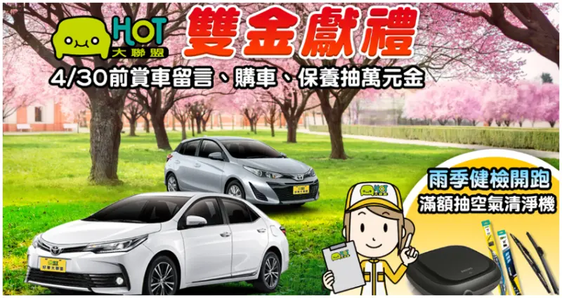 HOT大聯盟表示,「春來乍到 雙金獻禮」專案,【萬元金】抽獎活動(養車金或購車金二擇一),每週抽獎一次,未抽中者可再參與後續抽獎,將抽出九名幸運者;若買HOT認證車,還可參加月月抽萬元養車金(每月2名,共4名),希望購車前後都給喜愛HOT大聯盟的準車主們最無微不至的貼心服務。![]()