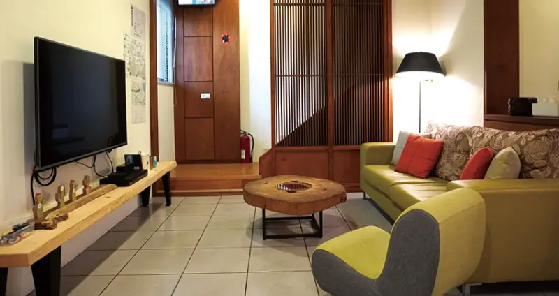 位在福仁宮、和平路後方的迷宮巷內,這裡是昔日外地雇工所住的矮屋街區,不似和平路的熱鬧喧囂,這邊有的是靜謐的日常感。矗立其中的白色透天厝屋齡雖3、40年,經整修後外觀乾淨利落,內部以簡約木質作為空間基調,溫馨舒適,每間房皆有大片落地窗,可俯瞰月眉地區廣闊的平原景觀;民宿主人希望能讓旅人停留在大溪的時間久些,體驗晚間清晨無人的老街、中央路早市的活力,重新感受不一樣的大溪魅力。