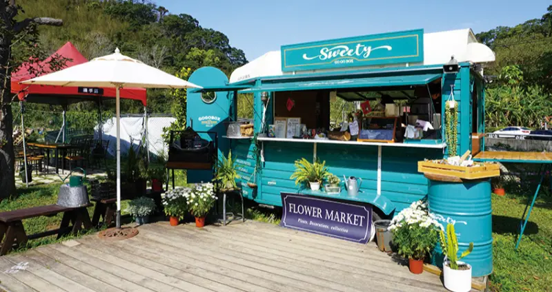 樂灣基地主理人是一對原本就從事美式餐飲的年輕兄妹,喜歡戶外活動的他們,某次機緣下將經營的店面轉型成復古餐車,並租下台7線路旁的閒置空地,將之打造成美式鄉村風格的露天餐車基地,提供用料實在的美式餐點,在戶外綠草地上用餐氛圍悠閒自在,是相當受來往旅人歡迎的中途休憩站。由於位在重機熱門騎行路段,也成為重機騎士聚集休息的據點;而不定期召集的主題市集,舉辦期間基地歡樂氣氛宛如嘉年華會。